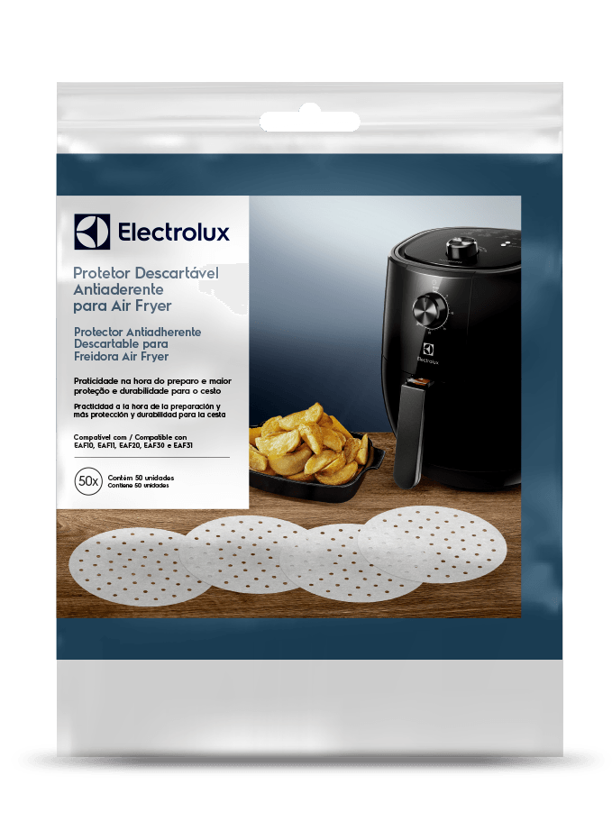 Pensando em mais praticidade e em um complemento para a sua experiência com as Air Fryers, a Electrolux desenvolveu o Protetor Descartável Antiaderente, que além de tornar o preparo dos alimentos mais prático, facilita a limpeza e prolonga a vida útil do revestimento interno do cesto das fritadeiras.